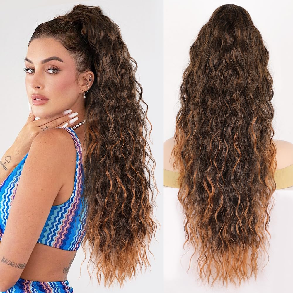 ALXNAN Claw Clip Ponytail,26 Inch Dark Brown With Golden Highlights Ponytail Extension for Women Synthetic Long Curly Wavy Clip in Ponytail Hair Extensions Synthetic Hairpiece for Daily Party Use