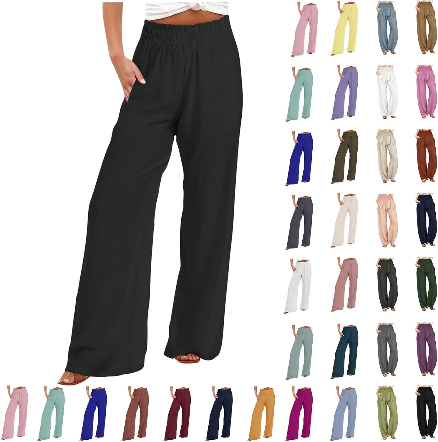 generic Linen Pants Women 2024 Summer Palazzo Flowy Pants Wide Leg Beach Pants High Waist Casual Vacation Trouser with Pocket