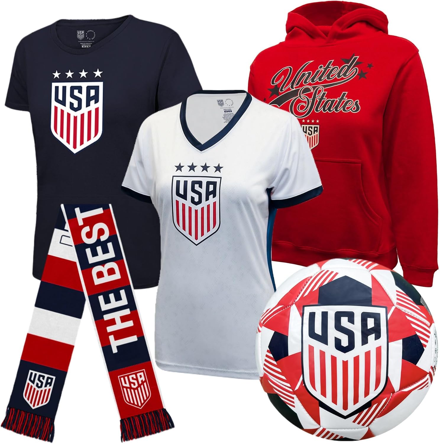 5-PIECE ULTIMATE FAN PACK – This exclusive set includes a stylish jacket, two vibrant T-shirts, a cozy scarf, and a size 5 regulation soccer ball—all featuring iconic U.S. Soccer branding.
