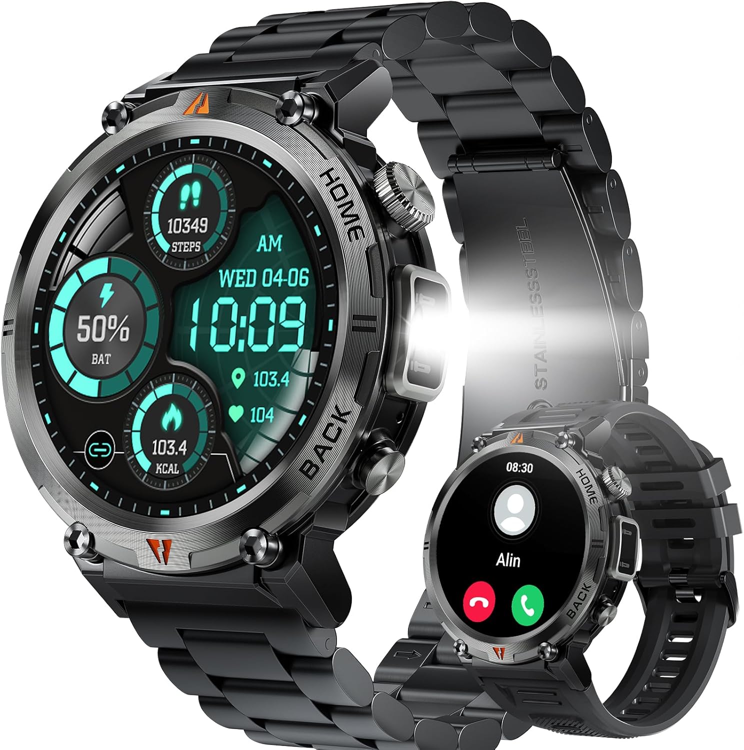 【Rugged Military Smart Watch】- LaNikar tactical smartwatch’s case is made of zinc alloy and has passed several military-grade tests such as extreme temperature, low air pressure, dustproof, and more for rugged durability! With the mechanical rotating buttons on the side, you can feel smart while still enjoying the feel of a regular mechanical watch! LaNikar men’s smart watch is also equipped with a flashlight on the side, so you will no longer be afraid of the dark, designed for outdoor sports!