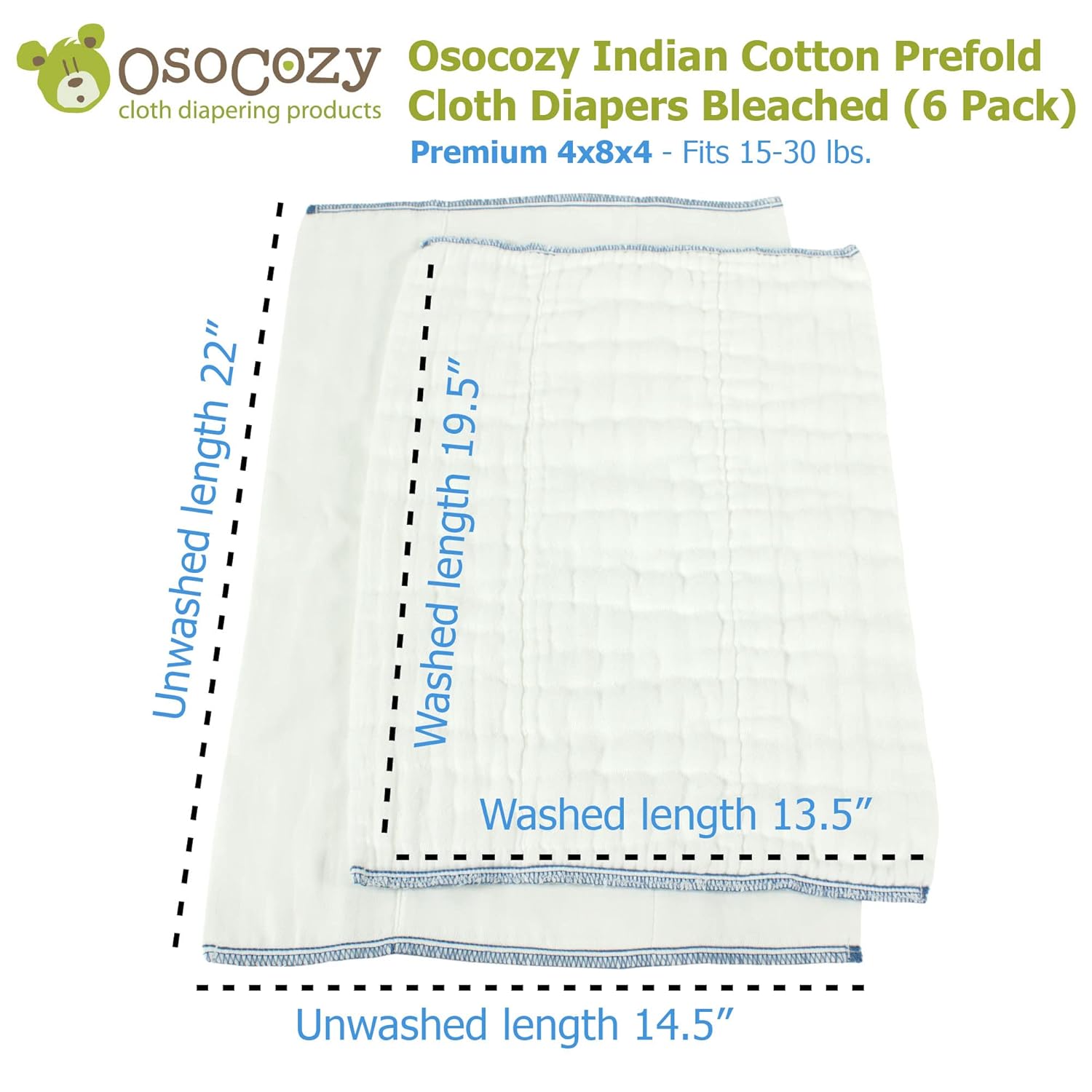 HIGHLY ABSORBENT – OsoCozy Prefolds Bleached Cloth Diapers are 4x8x4 in terms of layering. The middle panel having eight layers of cotton and outer panels with four layers, thus offering greater absorbency than other prefold brands.