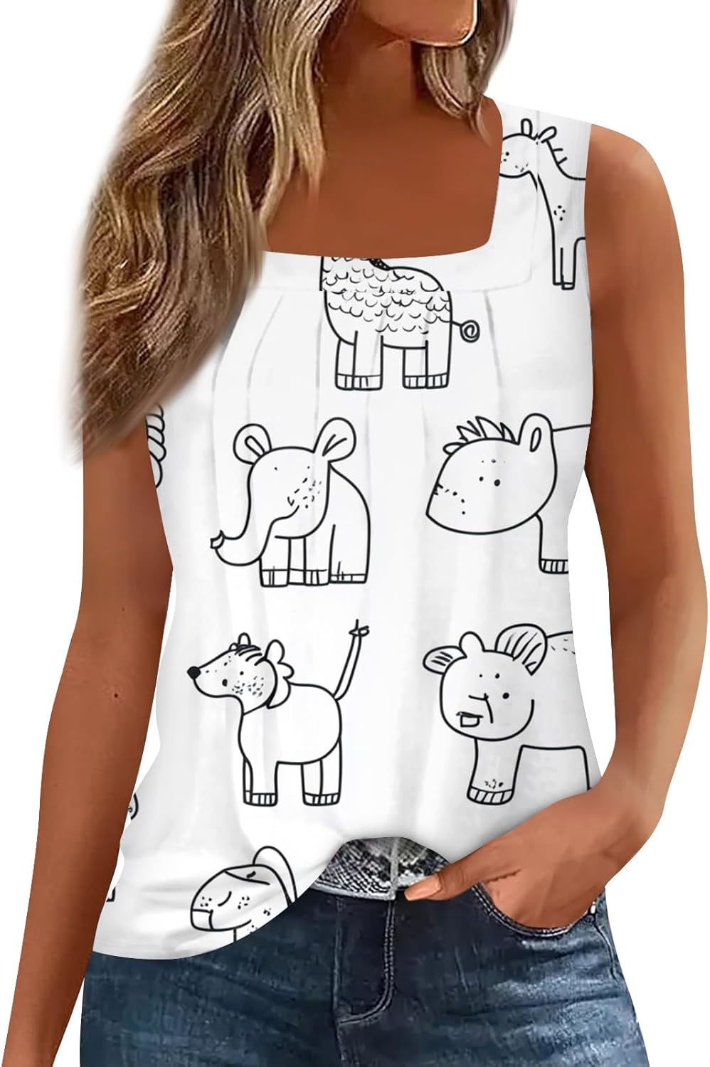 Plus Size Tops for Women Summer Tank Top Loose Fit Pleated Square Neck Sleeveless Tees Curved Hem Flowy Tunics