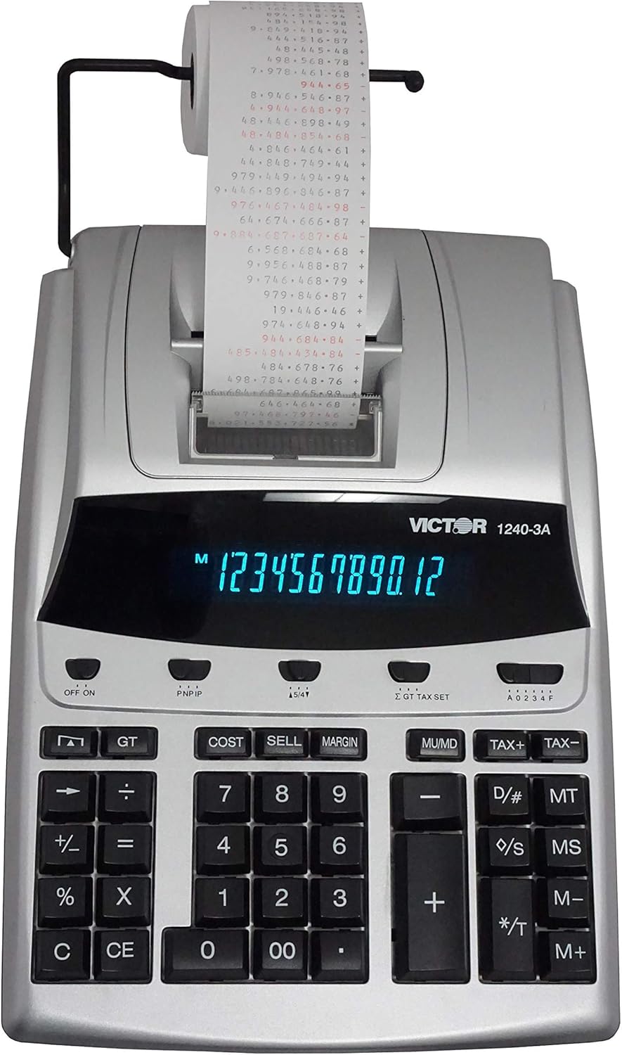 12 digit calculator is perfect for the everyday or moderate user, especially in a busy office setting. Features an extra large fluorescent display for easy viewing. Contemporary silver and black styling compliments any modern desktop decor. This calculator is manufactured with 45% recycled plastic. You can count on the fast and reliable 4.5 lines-per-second ribbon printer. Other functions include: markup/gross profit margin, automatic tax keys, constants in multiplication and division, percentage add-on and discount, time/date, change sign key, cost/sell/margin keys, large-size add and subtract keys, non-print or print mode, item count, fully selectable decimal settings, date/non-add key, markup key and selectable rounding switches and 4-key independent memory. AC Power. 3 Year Manufacturer’s Standard Warranty.